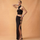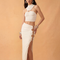 Woman wearing a white dress with cut-out design on a beige background